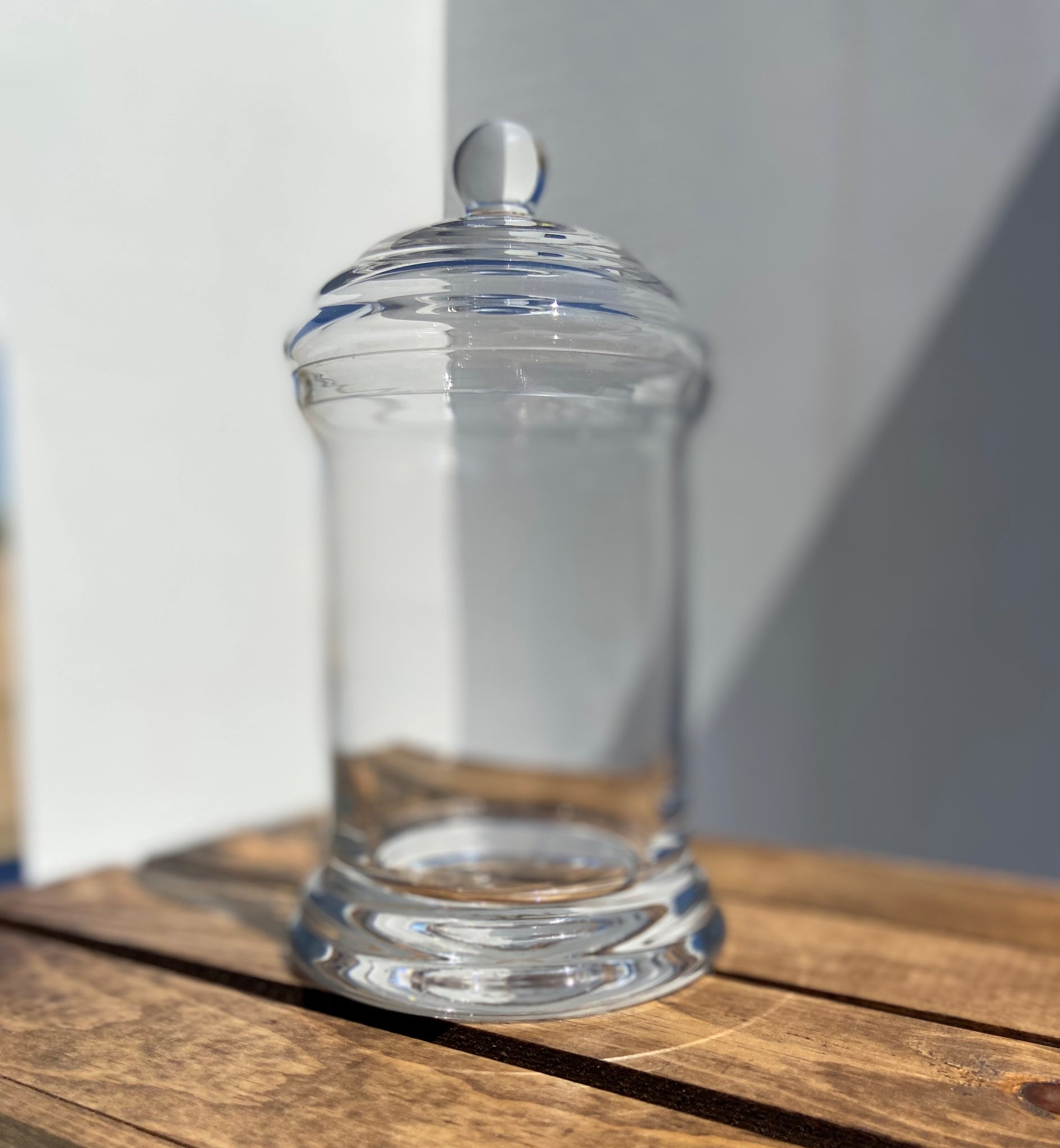 Clear glass container with lid. This container is great for so many items such as toiletries, crafts, food, candy. This is in excellent condition with no chips or cracks.