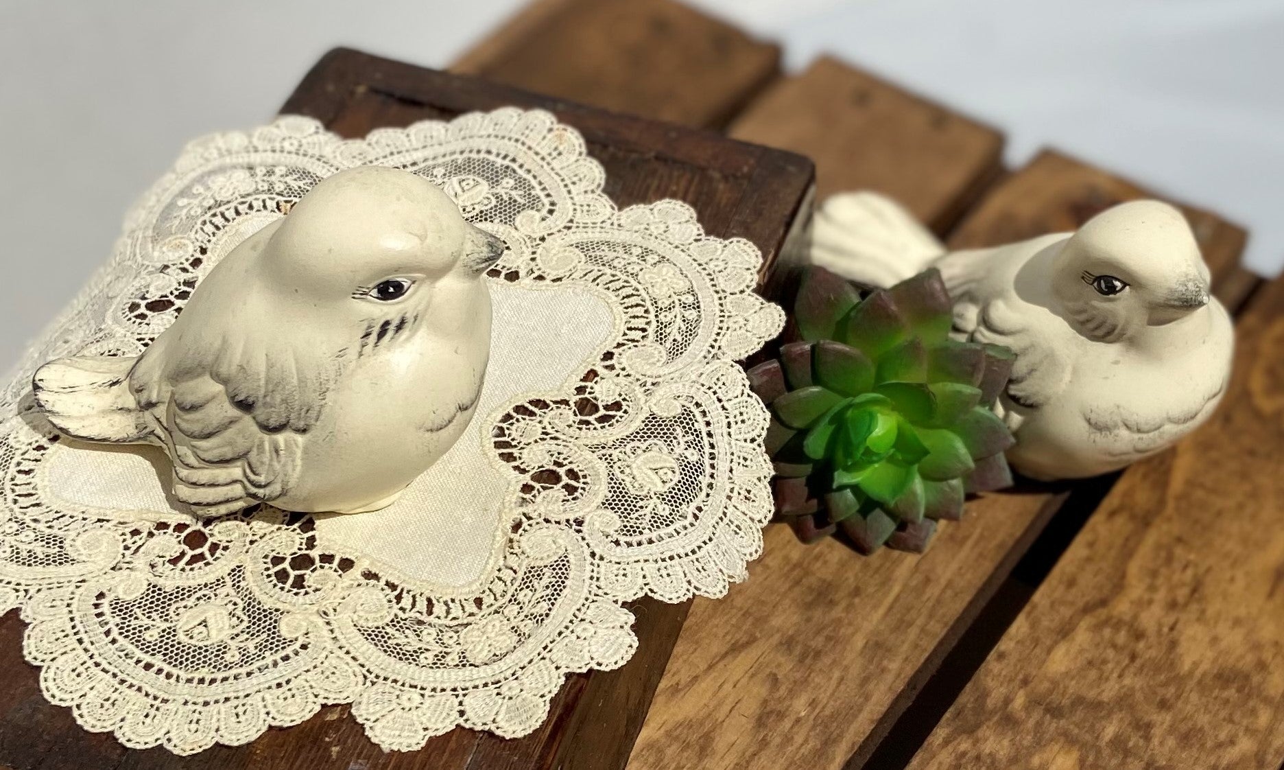 Pair of cream ceramic bird figurines. Place them on tables, shelves, hutches or in pots.