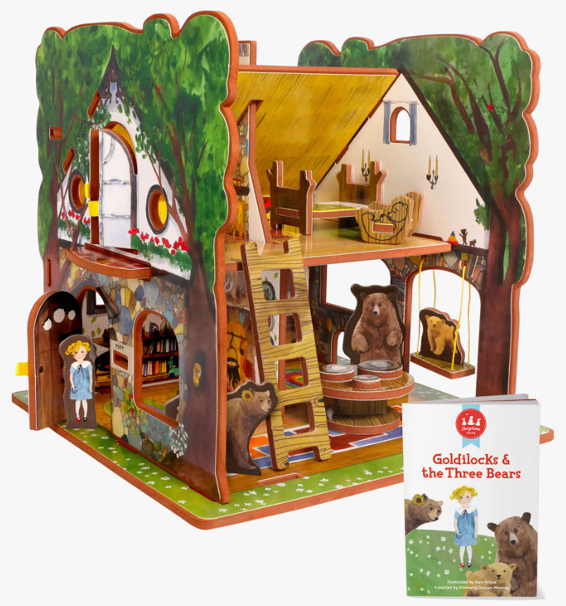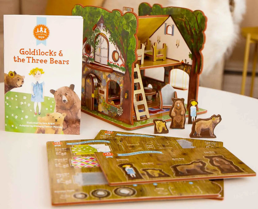 Build Mama, Papa and Baby Bear a forest tree house, with a working swing and a tree fort for Baby Bear. Each bear has its own bowl of porridge, chair and bed – just like in the story! Read the included storybook and then use the Mama, Papa and Baby Bear dolls to act out your own version of the tale. All pieces are made from Storytime’s unique combination of premium yoga/baby mat material (EVA foam) and high quality card stock. The tree house and characters fit together like a 3-D puzzle and fold flat in a travel-ready carrying case, conveniently designed to fit on your bookshelf. Assembling the bear’s dollhouse is as easy as pressing tabs into place. No tools or screws required.