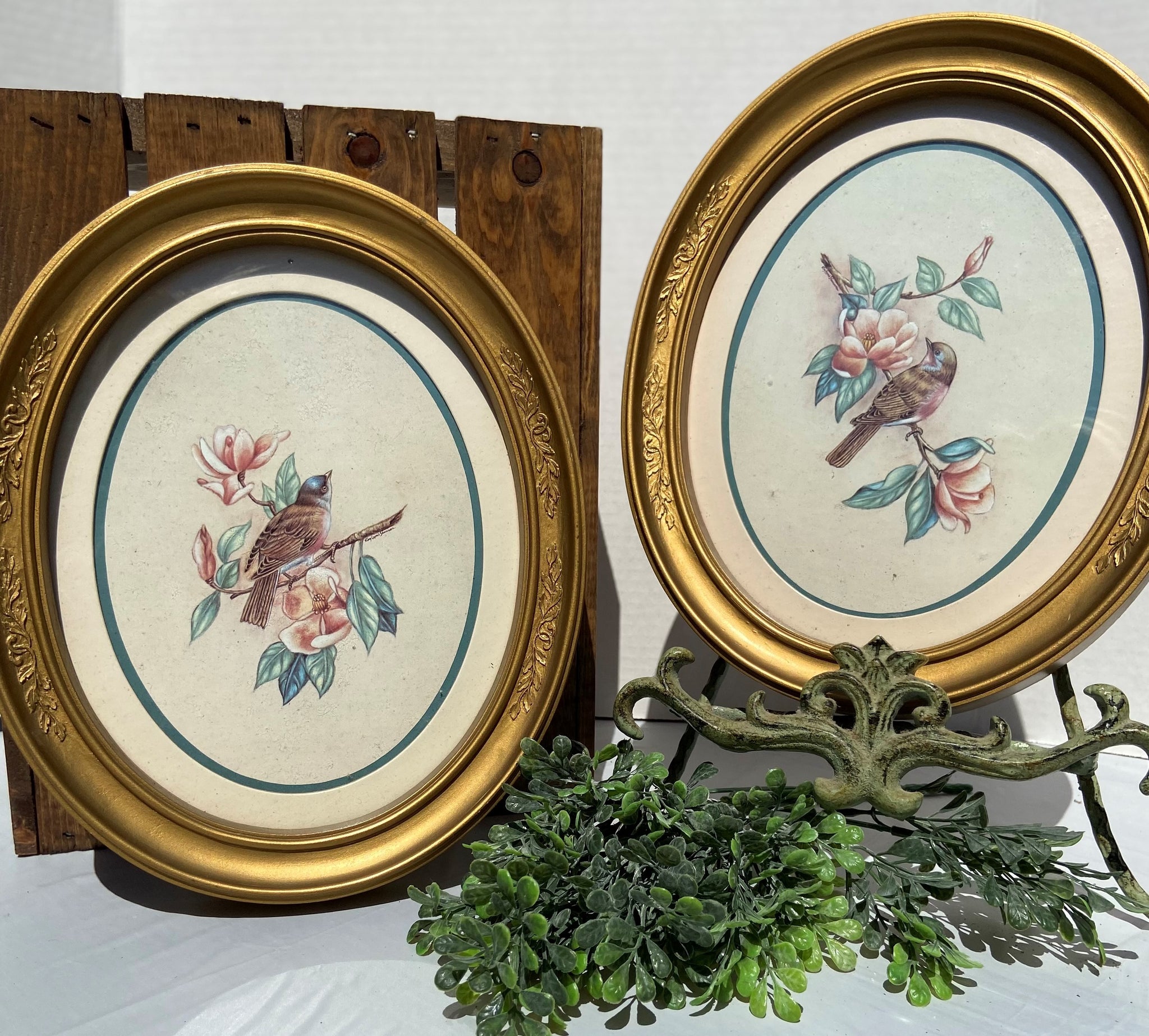 Vintage HOMCO Home Interior pair of oval gold framed bird pictures, measures 11” x 9”
