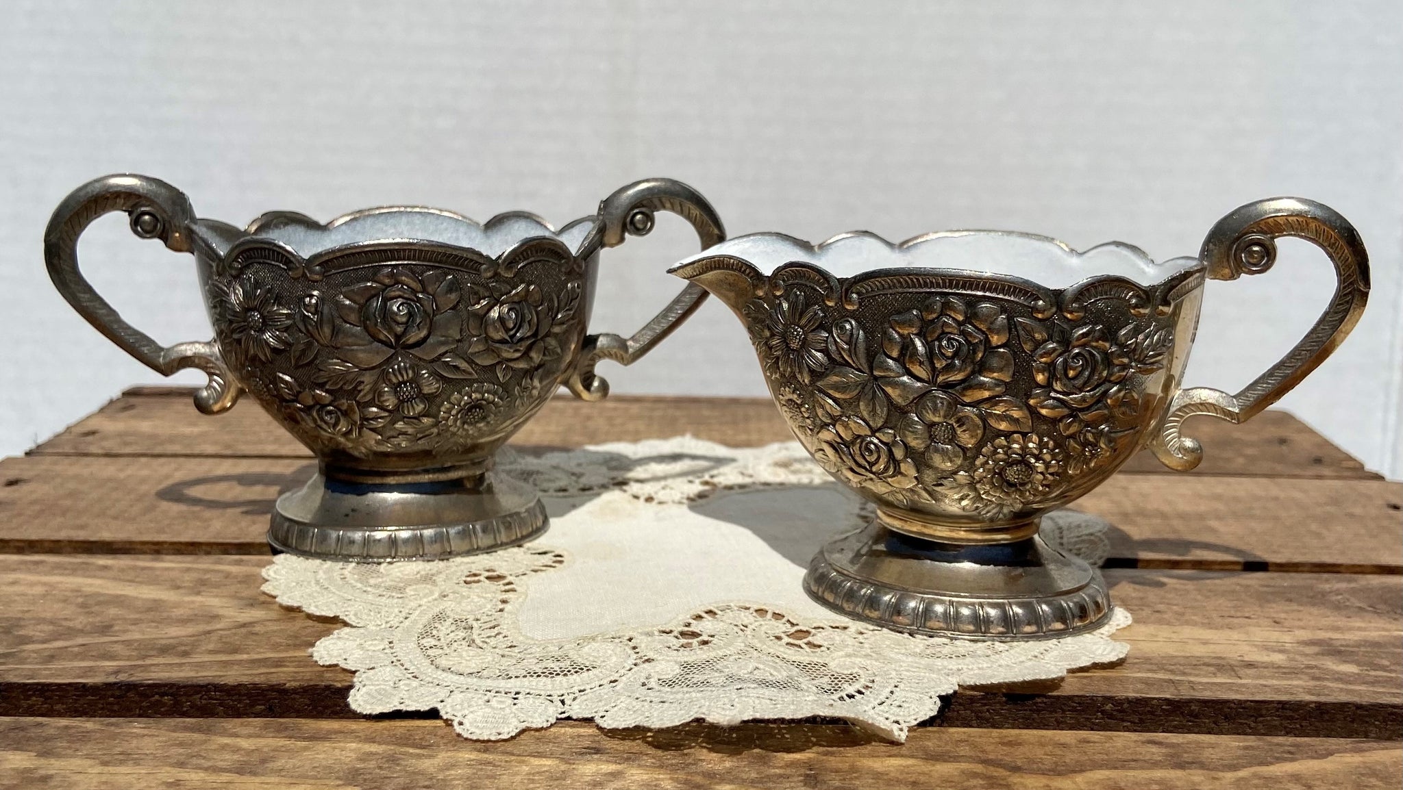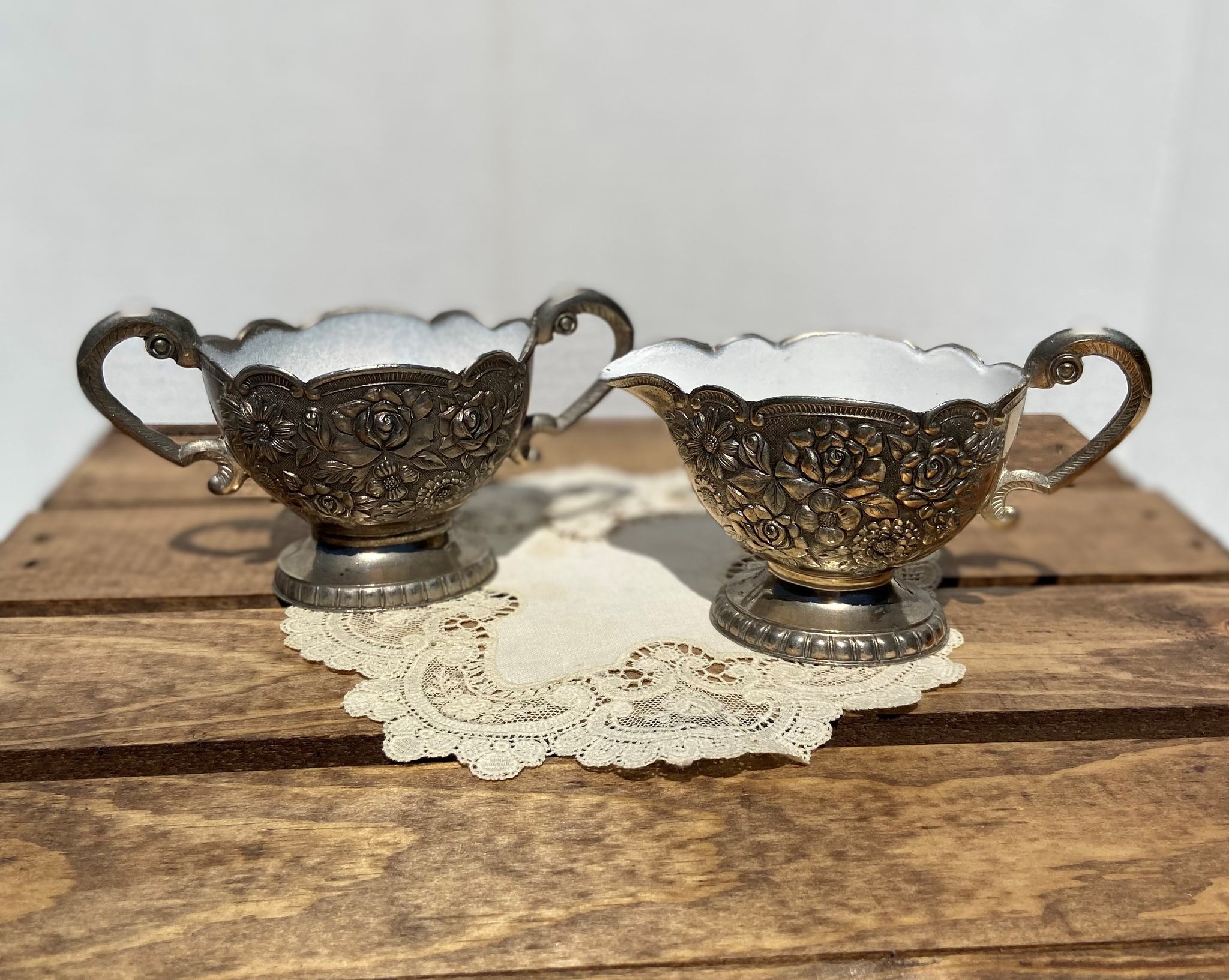 Vintage silverplated metal cream and sugar set, with embossed roses and a white enamel interior. The heavy ornamentation makes an ideal for a Victorian or Grand-millennial setting, beautiful for the holidays.